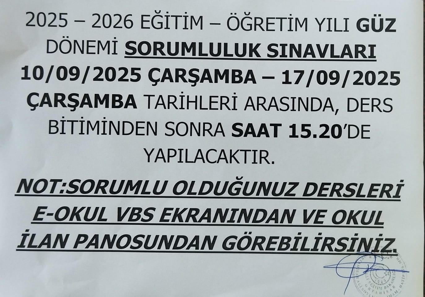 2025-2026 Eylül Dönemi Sorumluluk Sınavı Sınav Takvimi